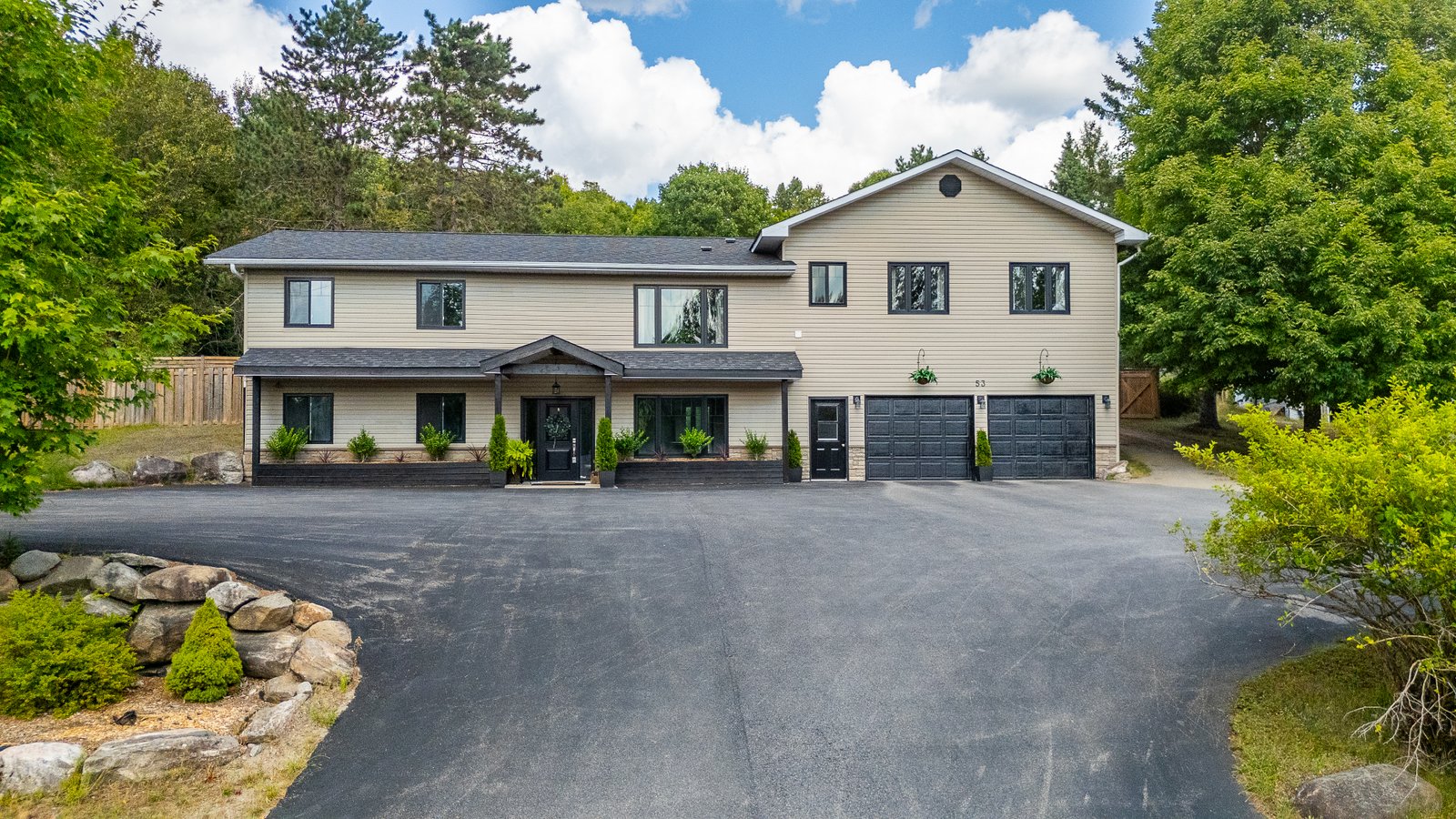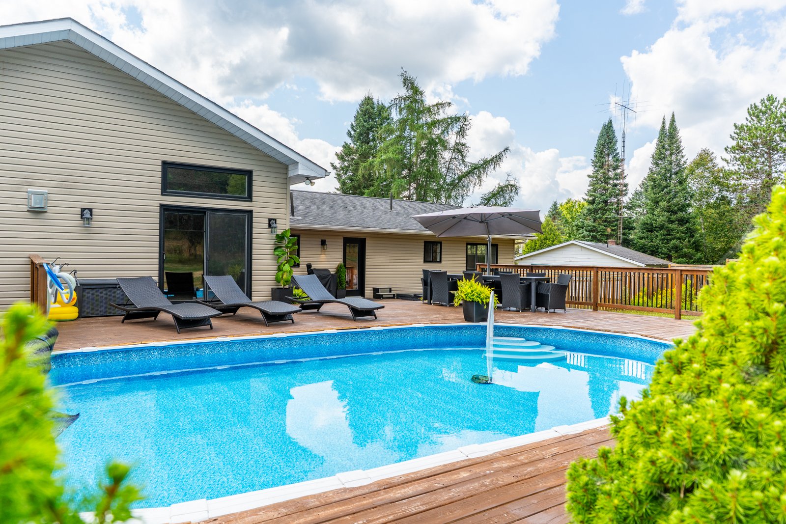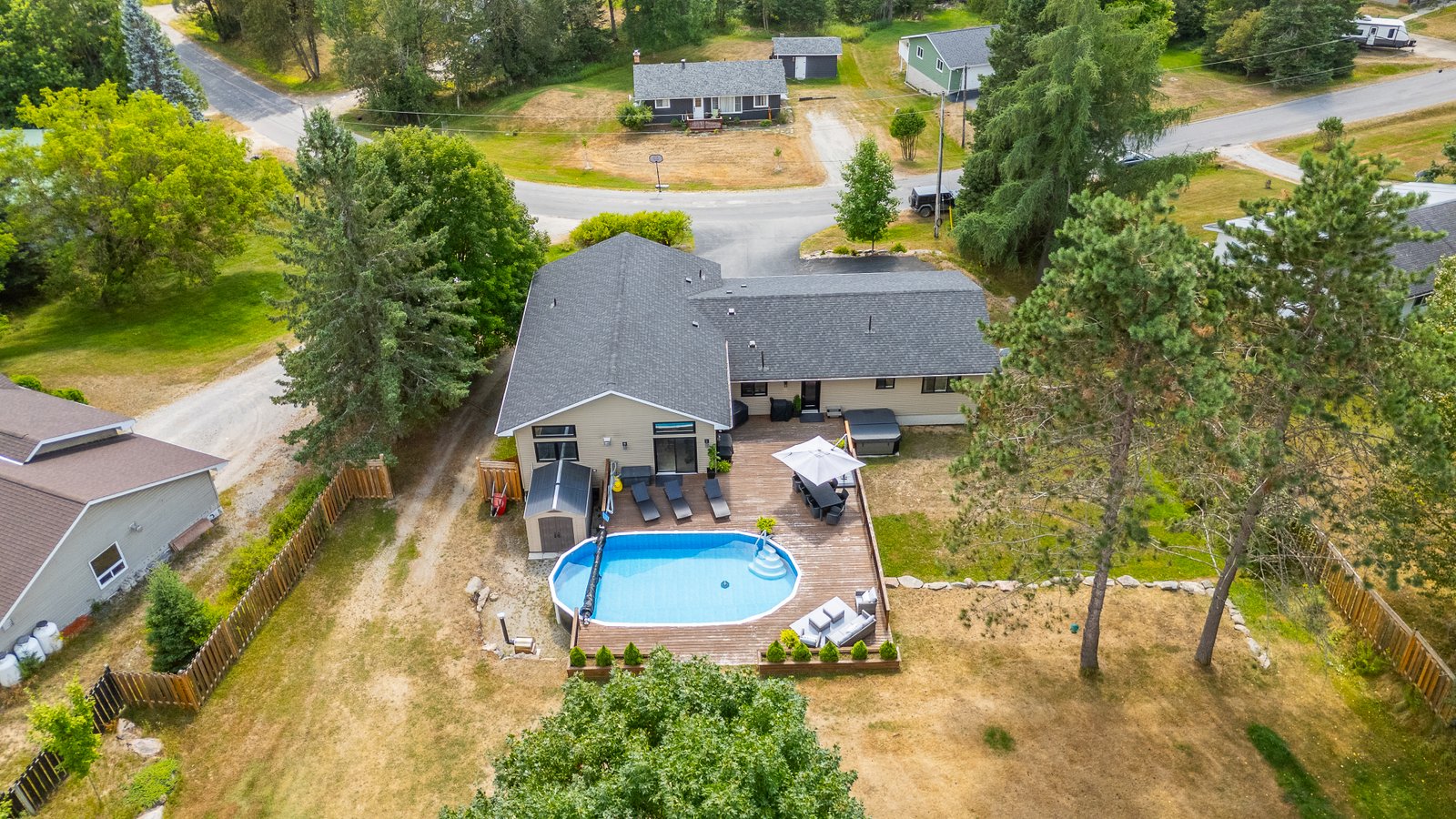 This beautifully maintained 4-bedroom, 3-bath raised bungalow offers the perfect blend of comfort, style, and privacy only 5 minutes from the Village of Haliburton. The spacious primary suite features a luxurious 5-piece ensuite, while 2 additional main-floor bedrooms each offer walk-in closets and share a well-appointed 5-piece bath. Enjoy open-concept living with a modern kitchen boasting concrete countertops, a large island with breakfast bar, and a walk-in pantry flowing seamlessly into the living room. The family room is a cozy retreat with a propane fireplace, large windows showcasing stunning views, and a walkout to your private backyard oasis. Step outside to extensive level decking complete with an above-ground pool, hot tub, and serene views of nature where deer frequently visit. The oversized attached garage (27' x 26') includes two large storage/workshop areas, perfect for hobbies or extra space. The finished lower level features a gym with pellet fireplace, a fourth bedroom, and a spacious utility room. A paved driveway and main floor laundry add to the convenience of this incredible property. Simply Stunning inside and out.