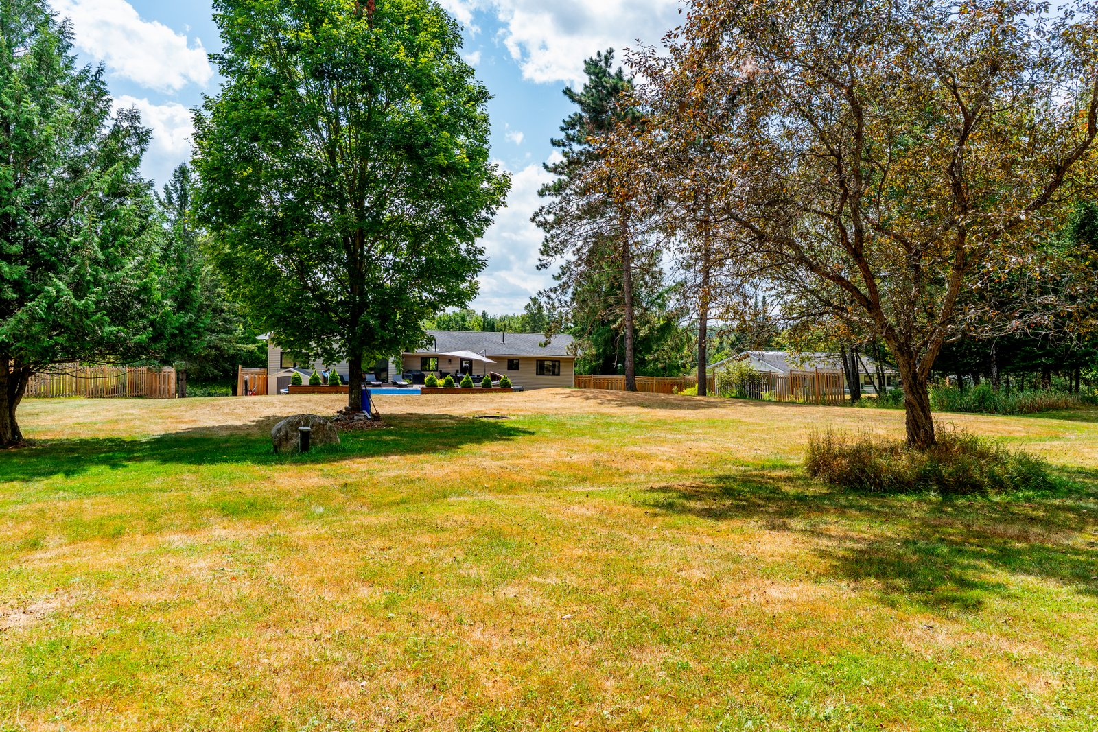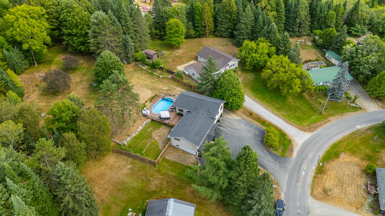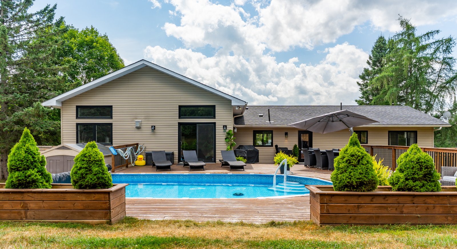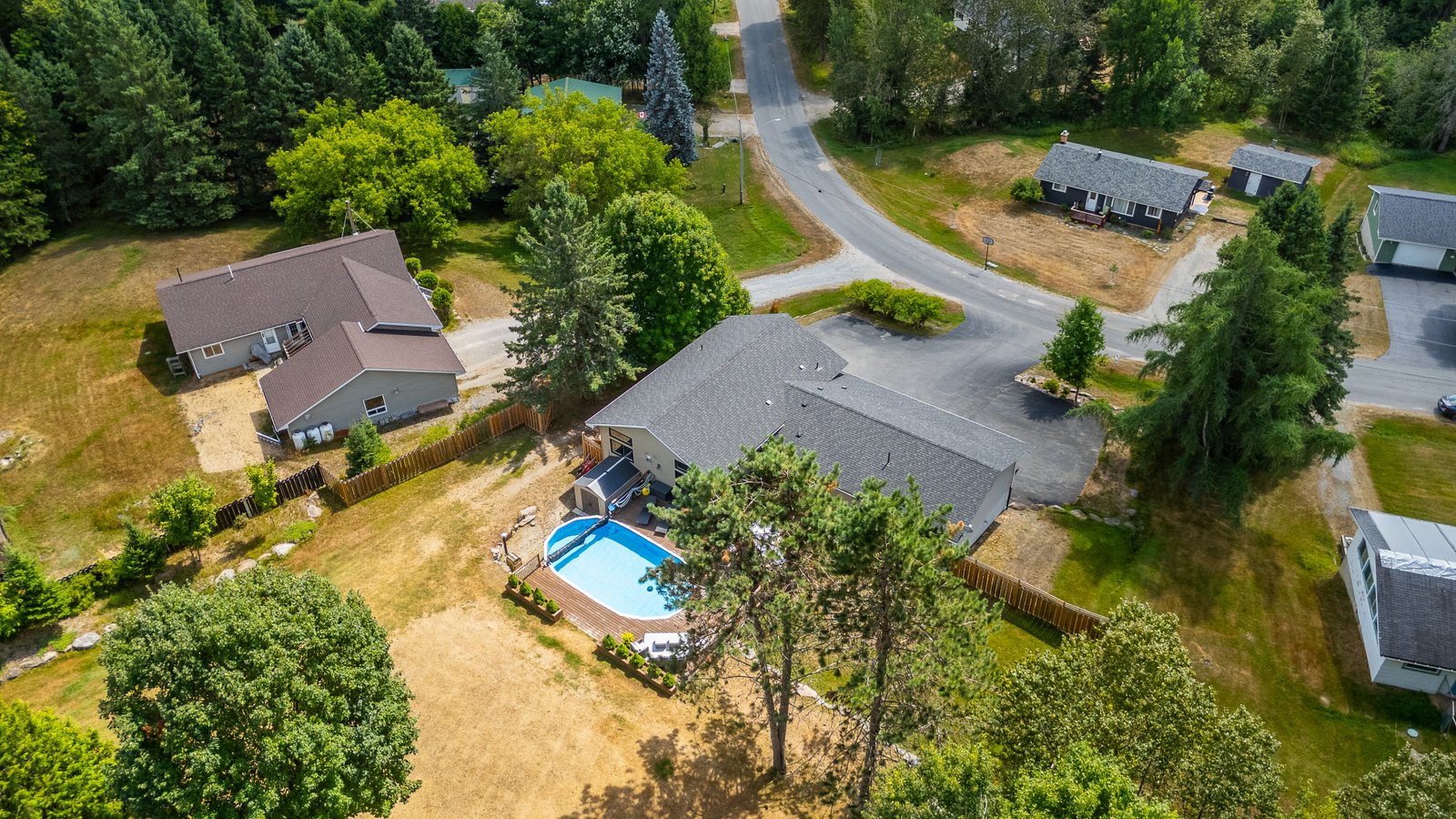 This beautifully maintained 4-bedroom, 3-bath raised bungalow offers the perfect blend of comfort, style, and privacy only 5 minutes from the Village of Haliburton. The spacious primary suite features a luxurious 5-piece ensuite, while 2 additional main-floor bedrooms each offer walk-in closets and share a well-appointed 5-piece bath. Enjoy open-concept living with a modern kitchen boasting concrete countertops, a large island with breakfast bar, and a walk-in pantry flowing seamlessly into the living room. The family room is a cozy retreat with a propane fireplace, large windows showcasing stunning views, and a walkout to your private backyard oasis. Step outside to extensive level decking complete with an above-ground pool, hot tub, and serene views of nature where deer frequently visit. The oversized attached garage (27' x 26') includes two large storage/workshop areas, perfect for hobbies or extra space. The finished lower level features a gym with pellet fireplace, a fourth bedroom, and a spacious utility room. A paved driveway and main floor laundry add to the convenience of this incredible property. Simply Stunning inside and out.